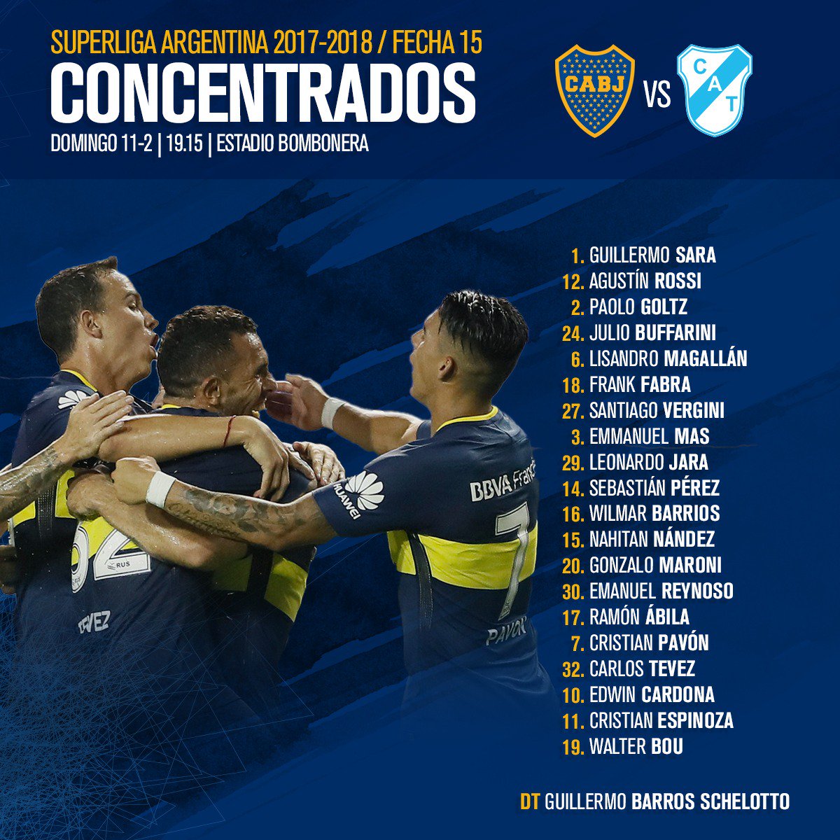 Por otra parte, Barros Schelotto le llevó tranquilidad a los simpatizantes, al afirmar que "Tevez está bien" y que ayer practicó de manera diferenciada solamente por precaución. De esta manera, el Apache será de la partida contra el Gasolero.