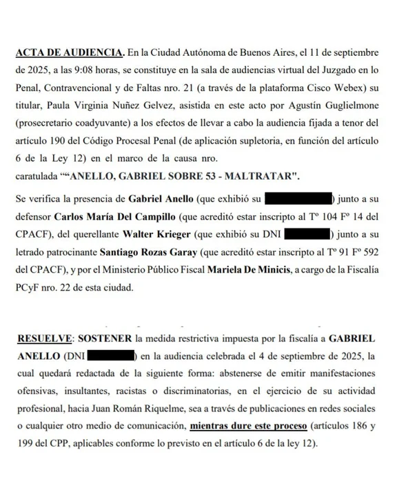 Gabriel Anello va a juicio por sus dichos contra Riquelme: la Justicia le pidió que no hable de forma "discriminatoria". Lo dispuso el Juzgado Penal, Contravencional y de Faltas Nº 21 de la Ciudad de Buenos Aires, a cargo de la jueza Paula Virginia Núñez Gelvez. Esto incluye sus expresiones "en redes sociales o cualquier otro medio de comunicación".